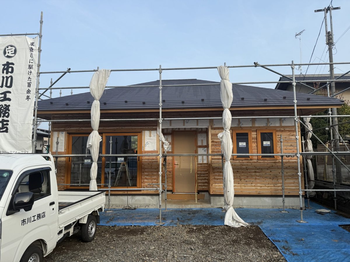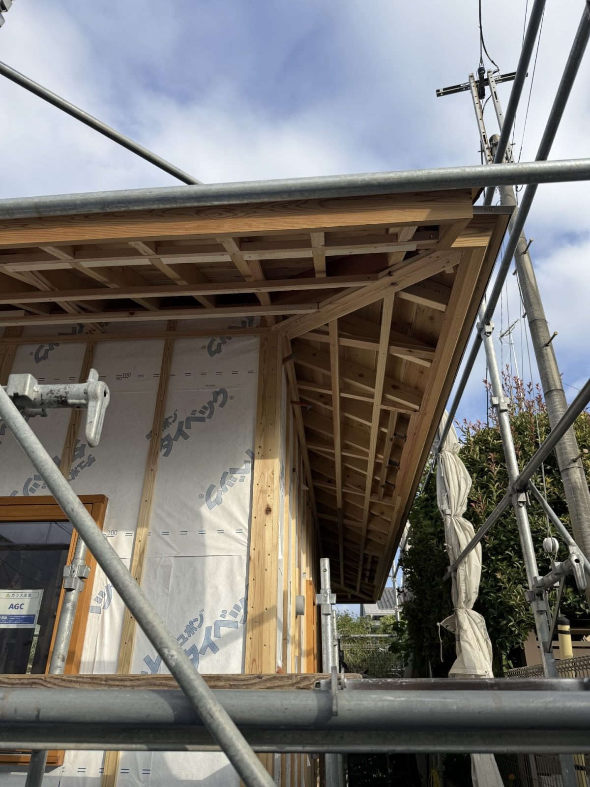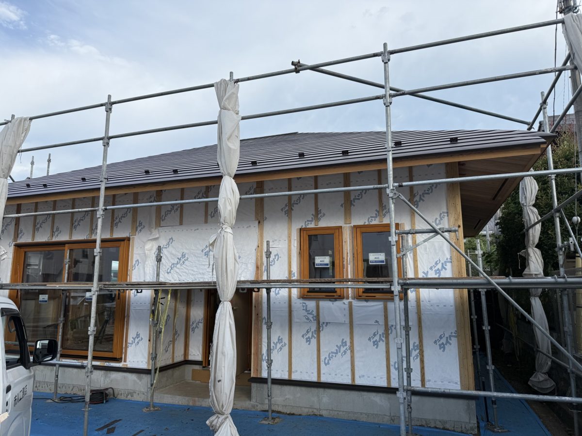外壁は空気の通り道を作る通気胴縁を打ってます。