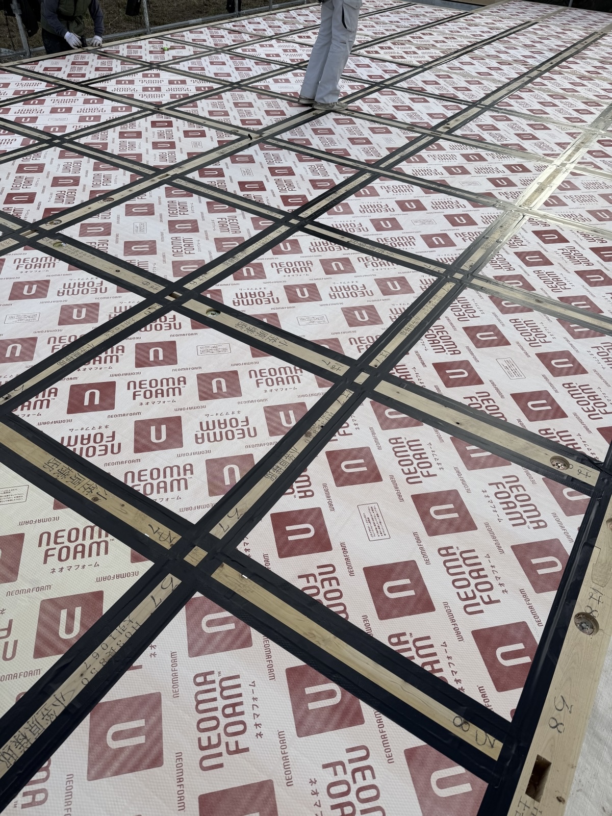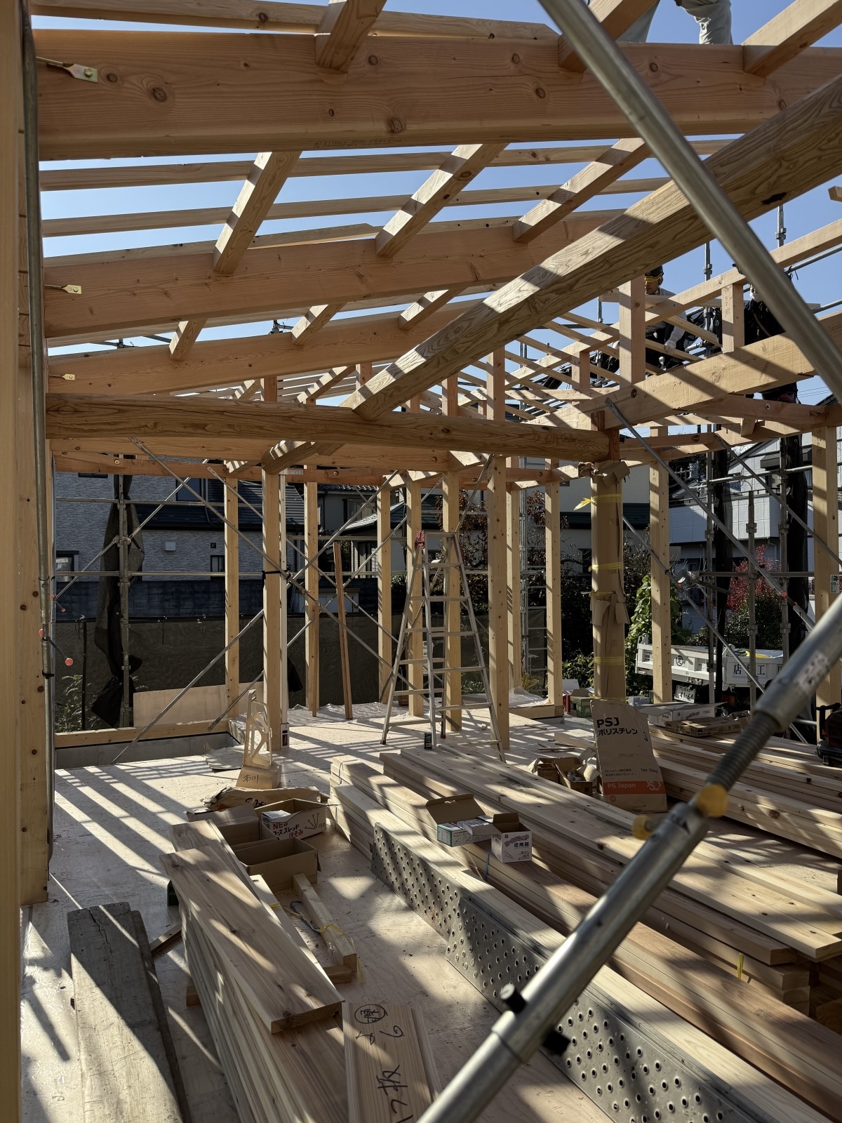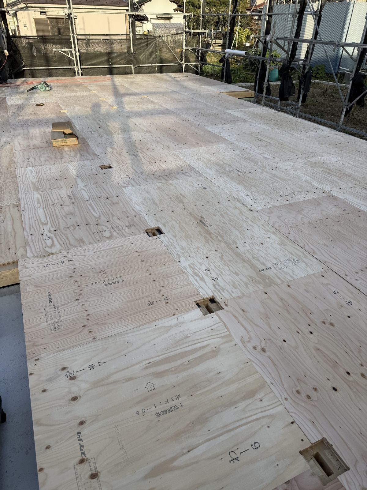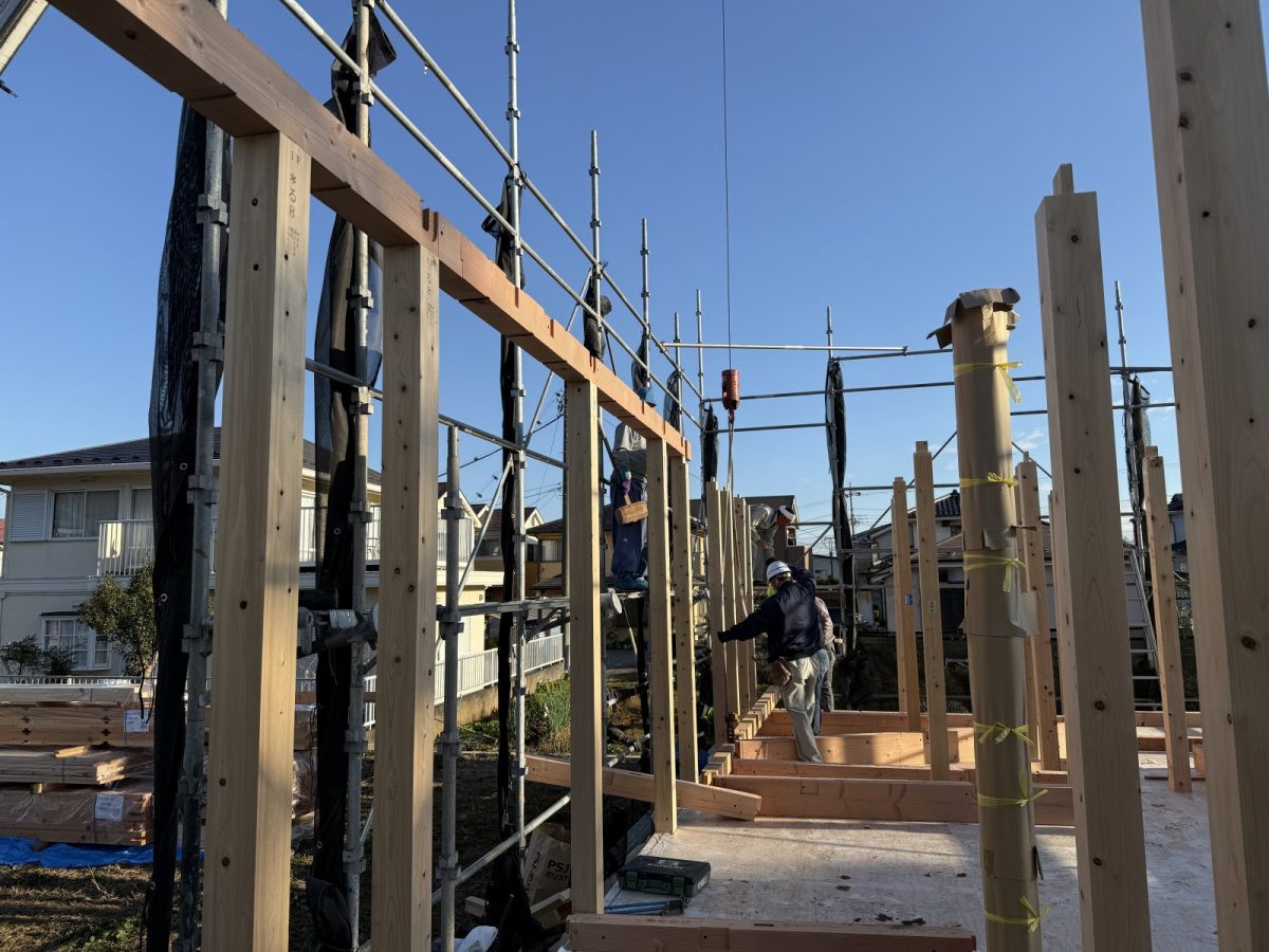2026.03.17 新築工事O邸 その4 基礎工事も終わりました。 次は、いよいよ建て方です。 土台を伏せて断熱材を入れます。 その上に合板を張り… 柱を建て、桁、梁を収めます。 加工した梁が収まりました。 ホットしました。綺麗ですね! 屋根下地まで無事終わりました。 SNSでもご購読できます。