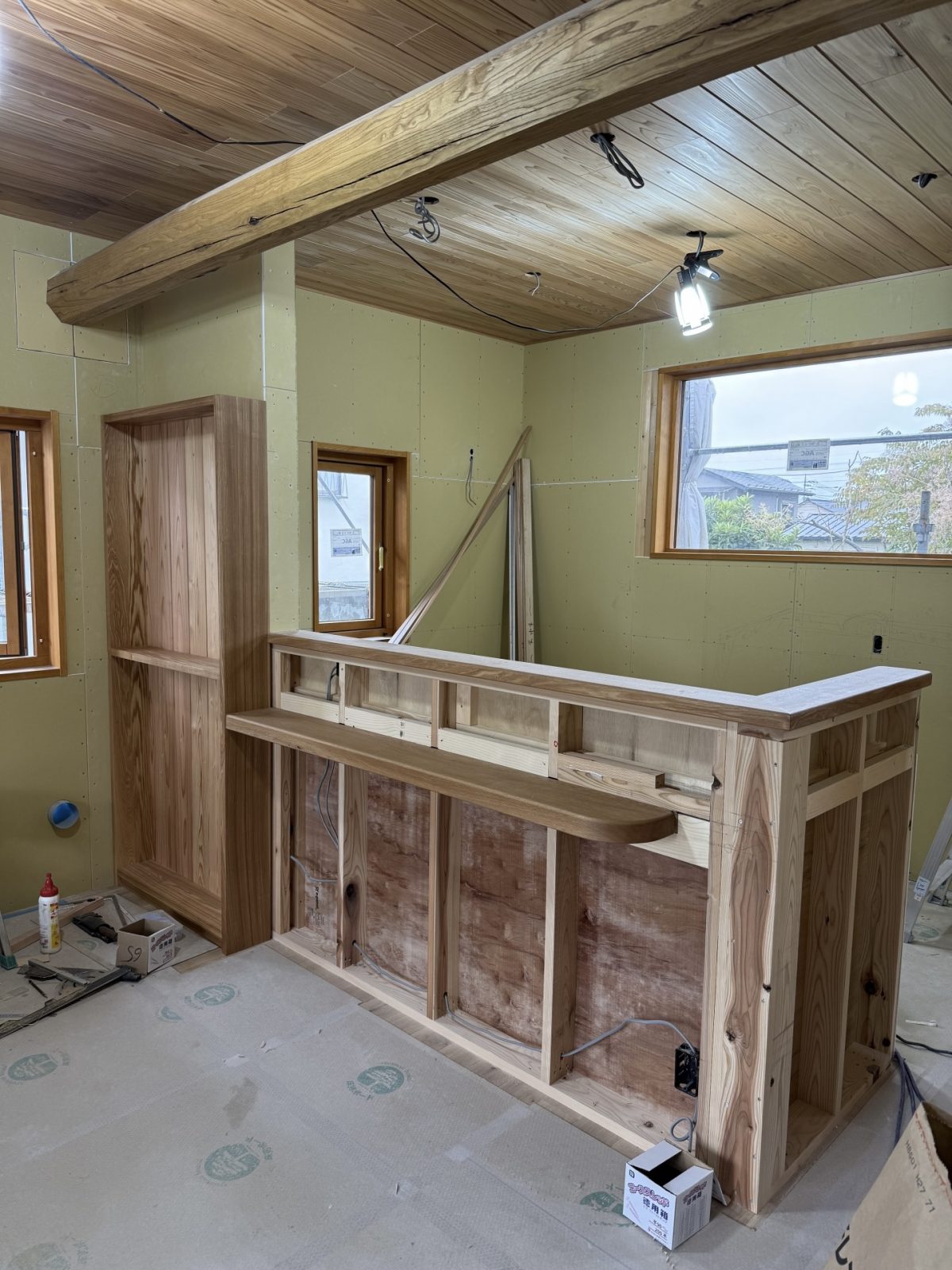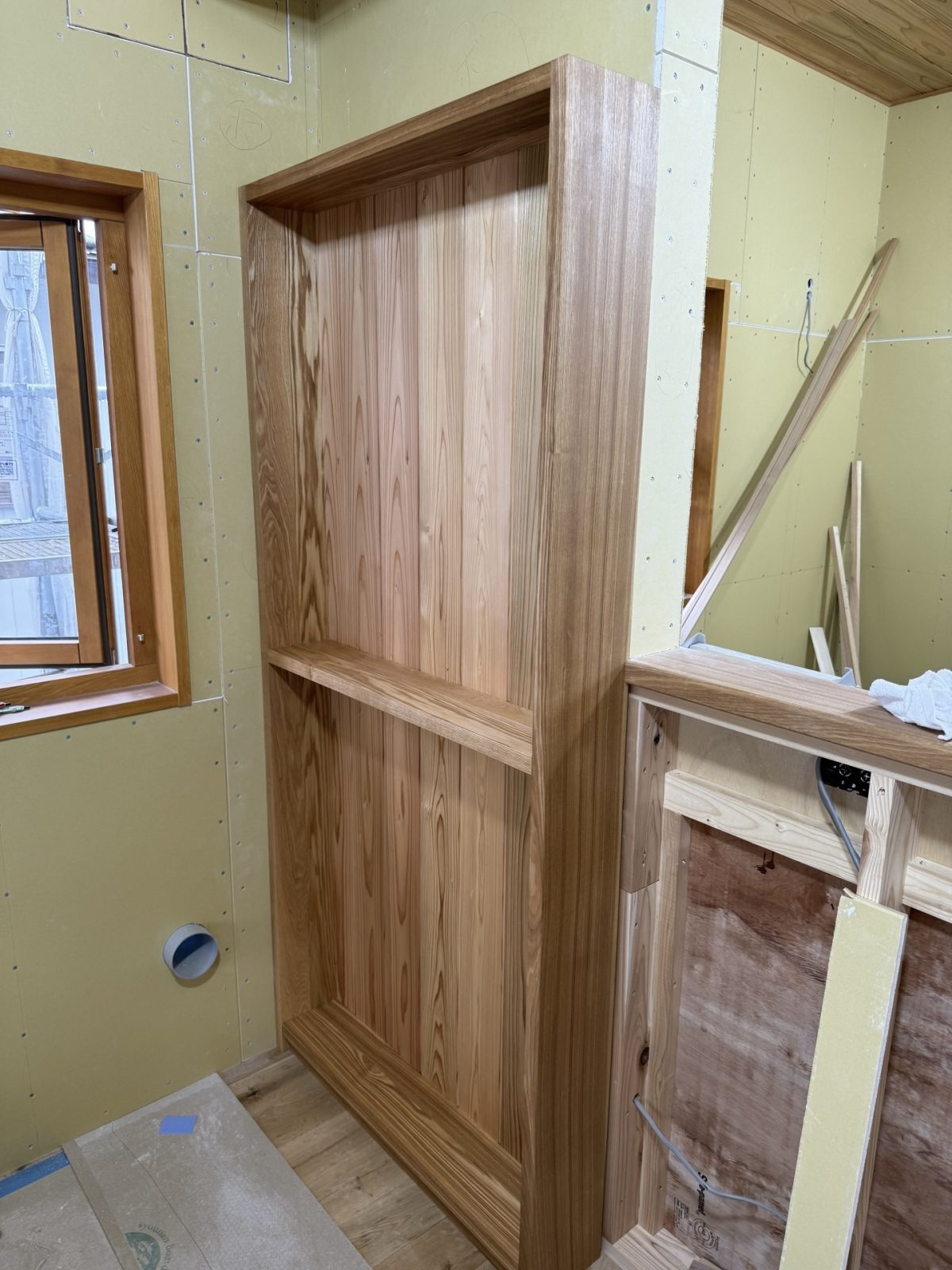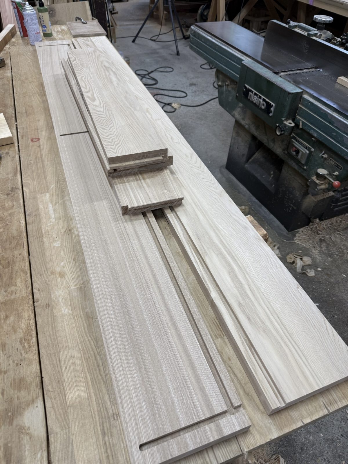 キッチンカウンター横に取り付ける物入れです。カウンターと同じタモ材になります。