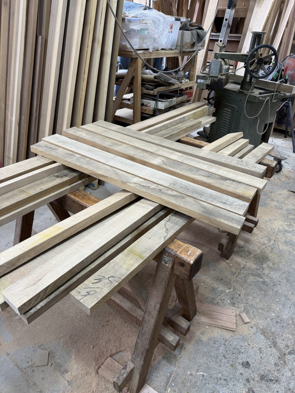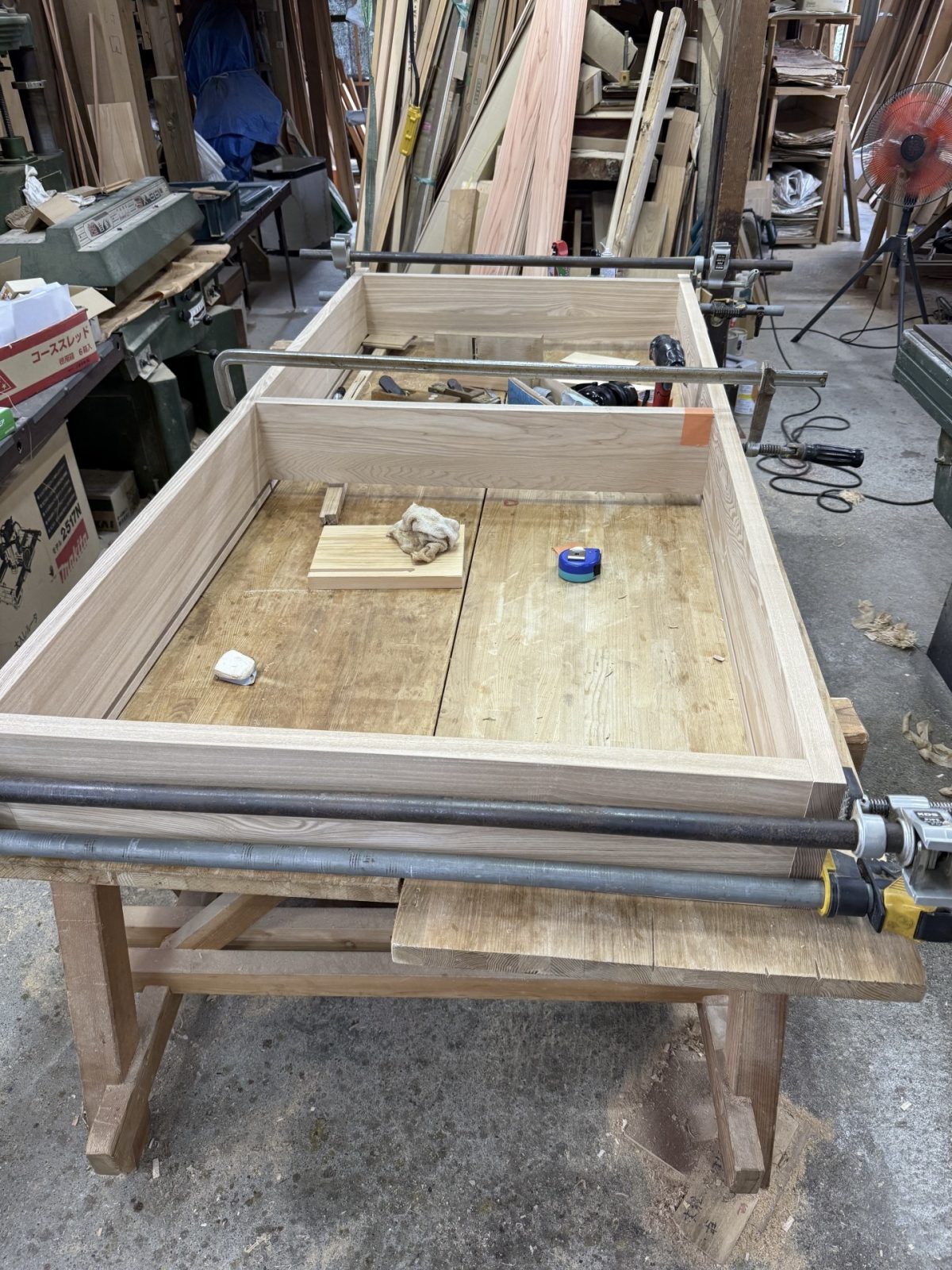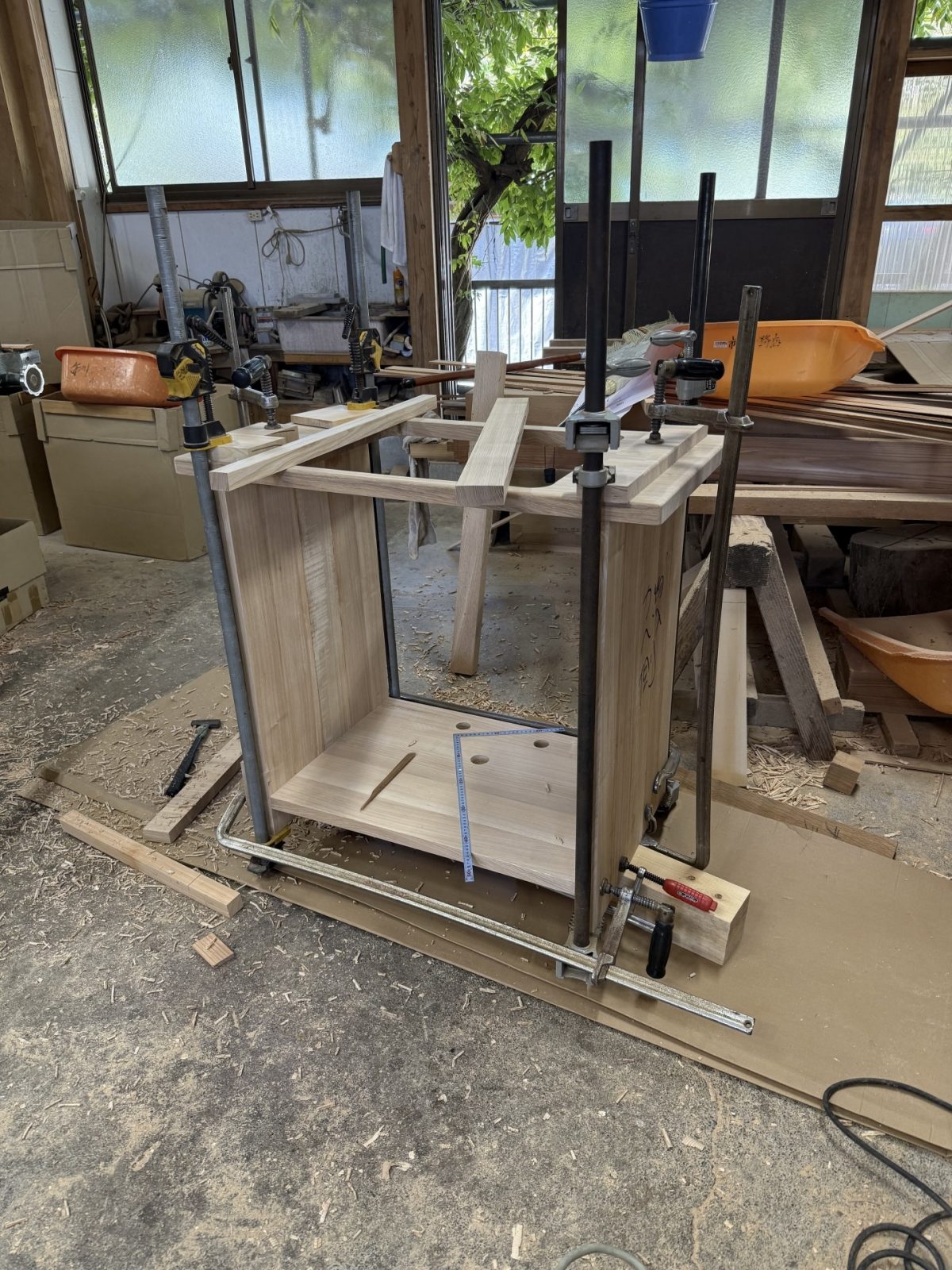 キッチンカウンター横に取り付ける物入れです。カウンターと同じタモ材になります。