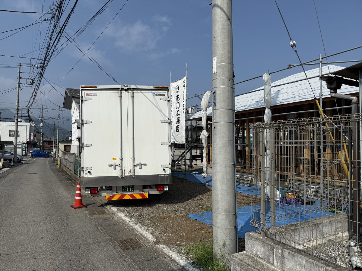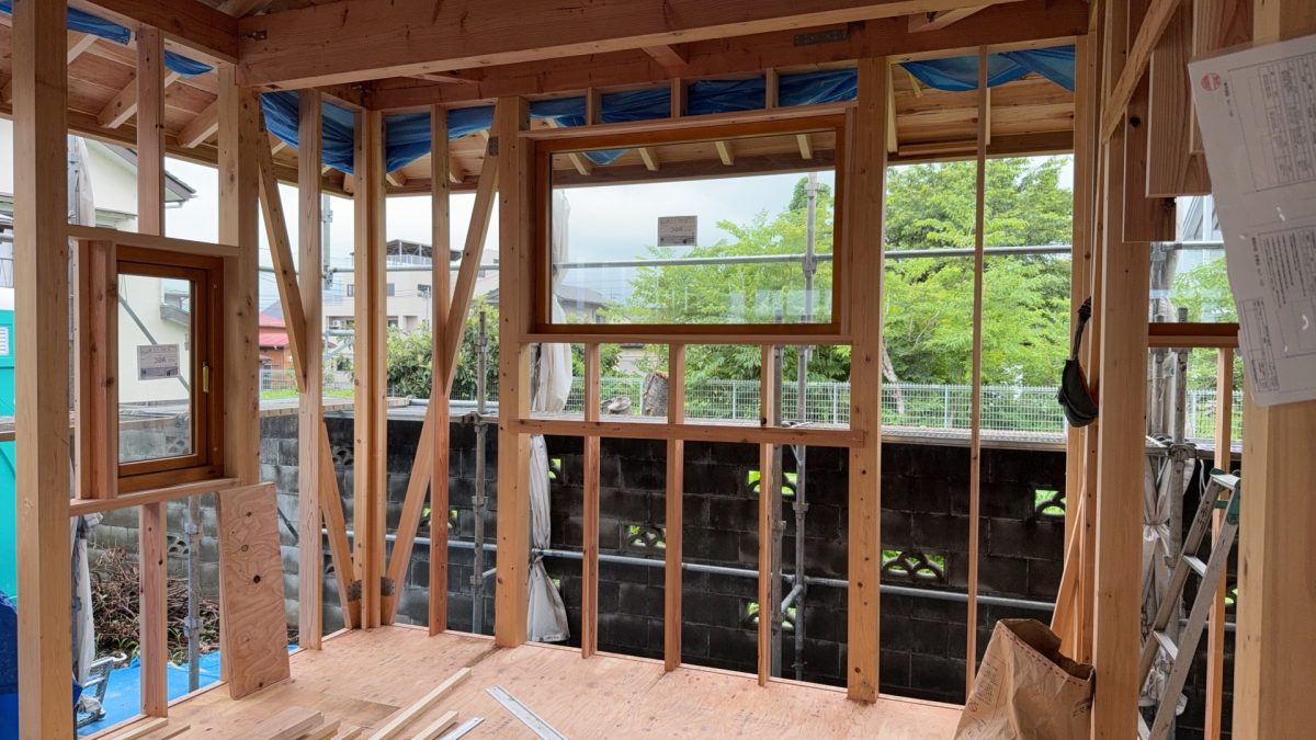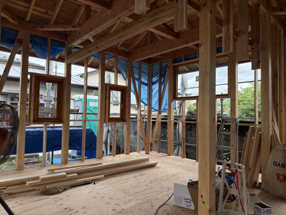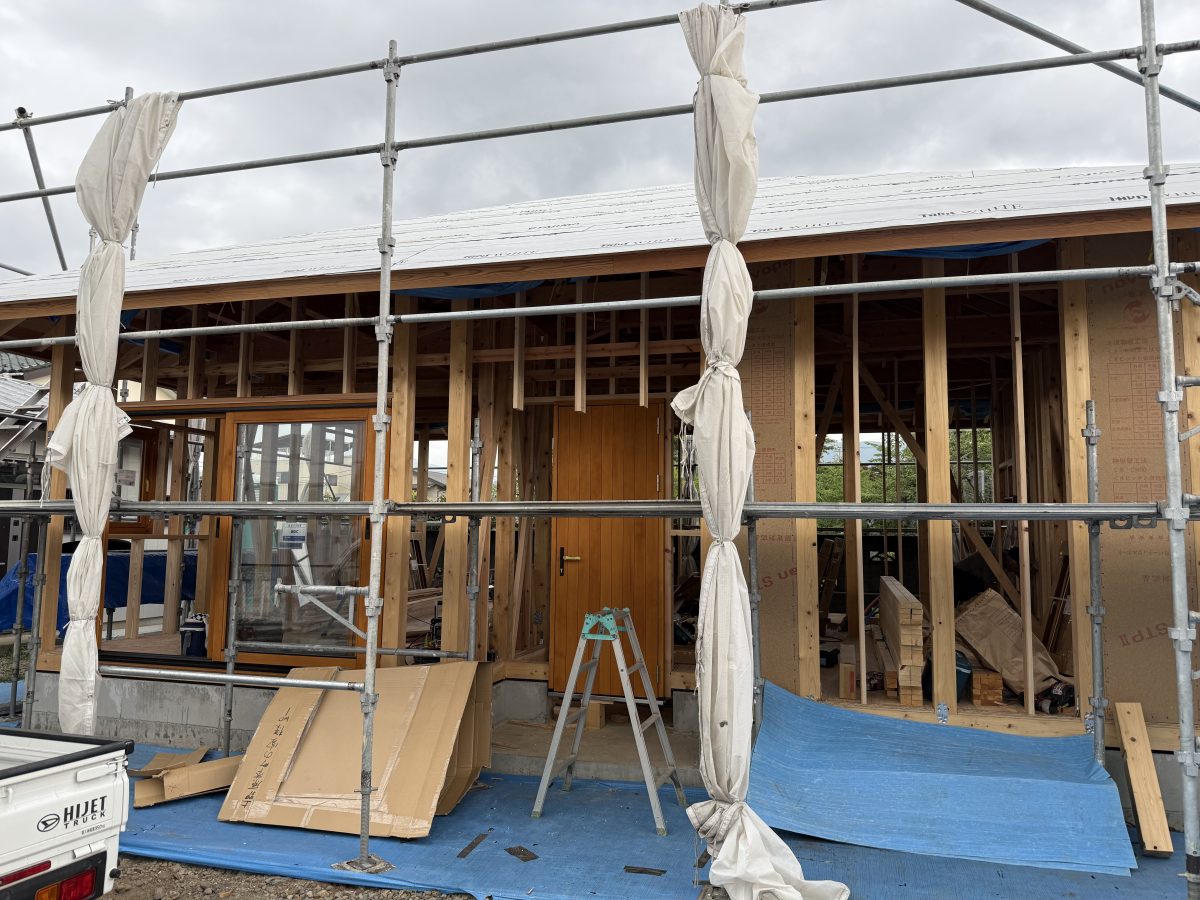 2025.09.28 新築事務所工事 その4 屋根下地、壁下地が終わり、サッシを取り付けます。 画像では分かりづらいですが、木製のサッシです。 アルミサッシ、樹脂サッシでは表せない温かみ、質感、風合いがあります。 サッシが入れば外部に透湿シートを貼ります。