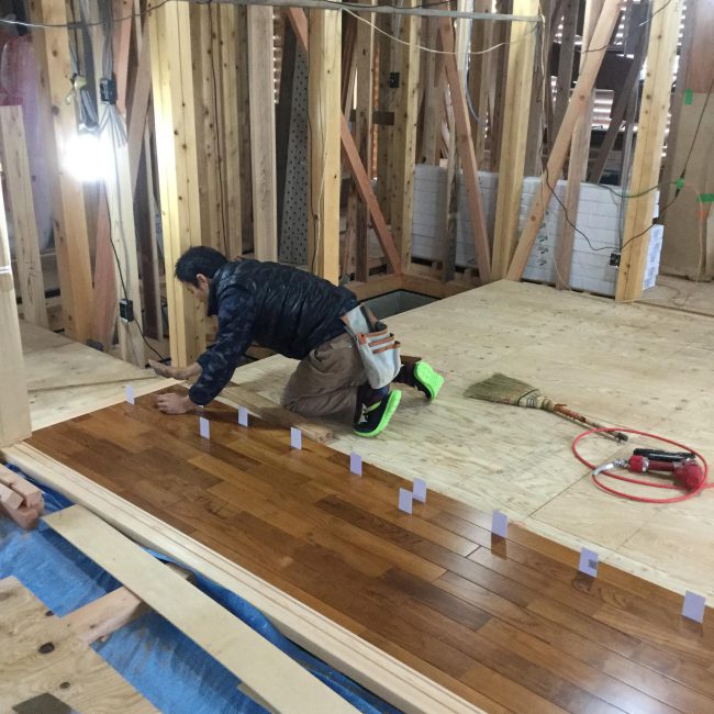 湿気で伸びてしまうので、若干隙間を開けて床を貼ります。