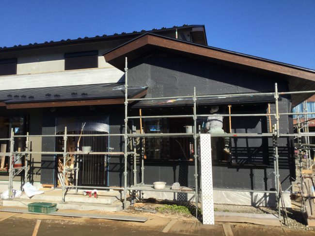 左官屋さんが表側の下塗りを始めました。私の祖父から付き合いがあります。