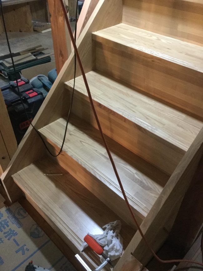 2017.02.12 O邸 その40 階段完成です。 これで2階に上がりやすくなりました。 解り辛いですが、一坪ある押入れです。中段を二段作ります。押入れなどは、お客様とどんな物を入れるか良く話し合い、棚の種類を決めます。 天井竿も終わりました。