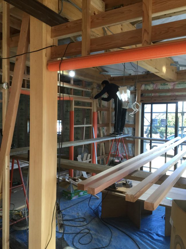 2017.02.06 O邸 その46 久々のO邸です。2階、工事終わりました。クロスを貼り完了となります。 クローゼットの棚です。右側棚下にはハンガーパイプを取り付けています。 私は居間の天井に掛かりました。